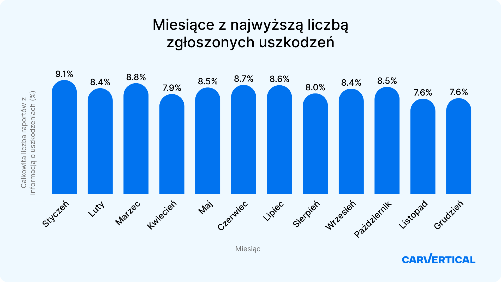 W badaniu carVertical przeanalizowano raporty historii pojazdów zakupione przez użytkowników firmy w latach 2018–2024. Zapisy dotyczące uszkodzeń w raportach zostały posortowane według miesięcy, przeliczone na wartości procentowe i uszeregowane.